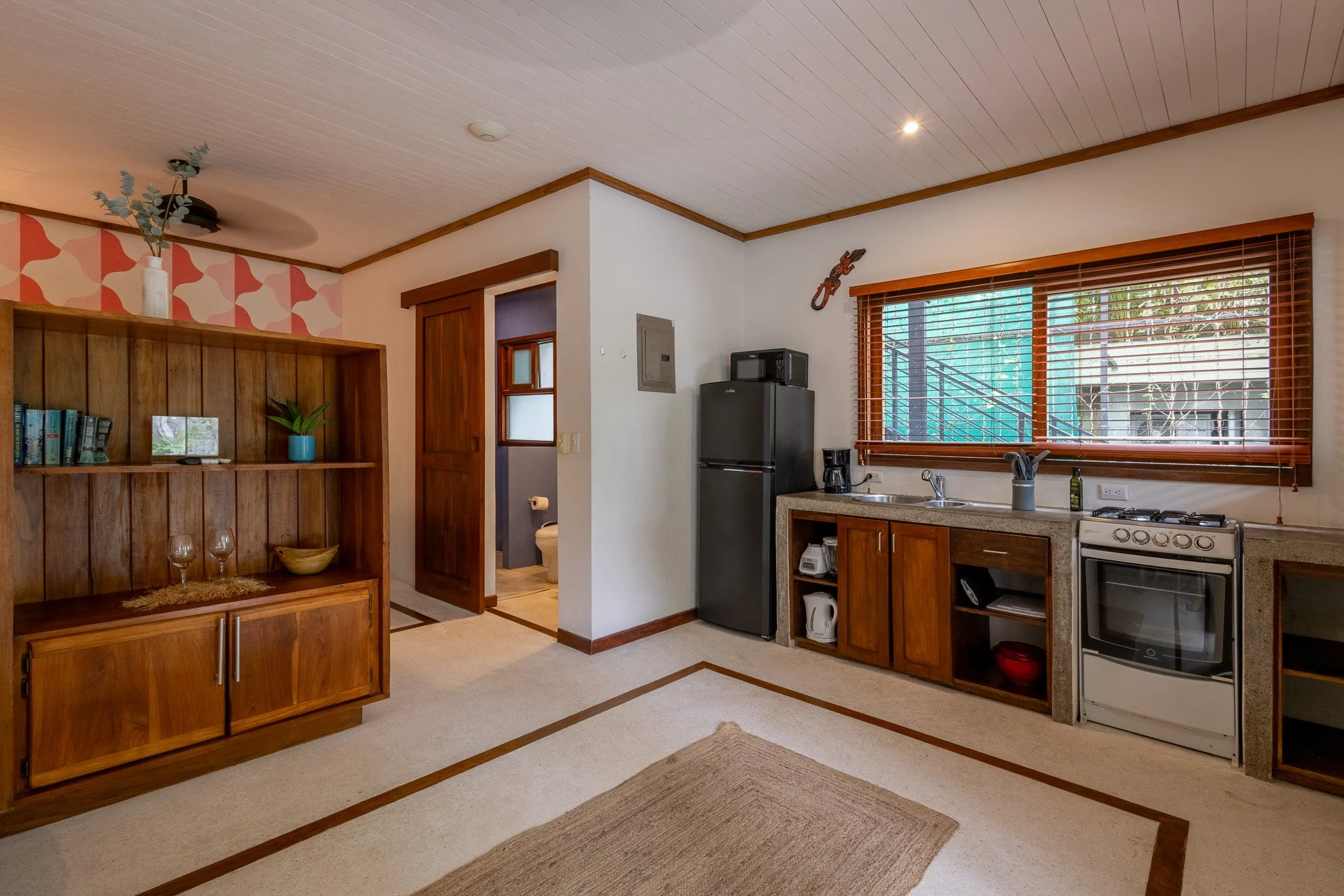 Studio Pacifico is a well equipped studio with a comfortable king bed and an additional twin bed on the opposite side of the studio. The king bed can be converted into two twin beds, making a total of three twin beds for guests looking to share space. All of the mattresses are high quality foam mattresses imported from the USA for your comfort. The studio has a large private bathroom with a hot water shower. Enjoy the comforts of a full kitchen, oven with stove top, fridge, coffee maker and cookware.